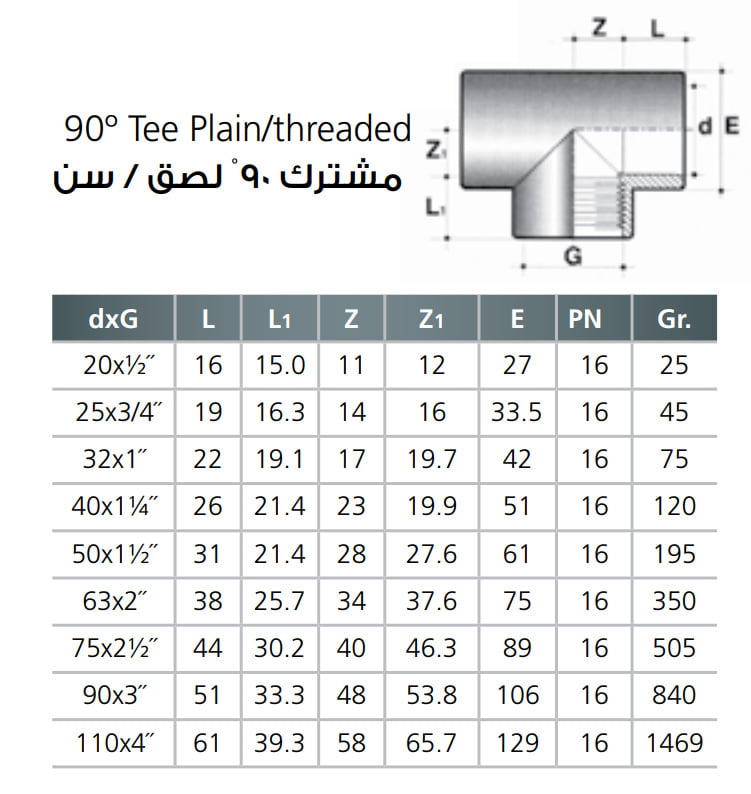 | Diameter | 20x½˝, 25×3/4˝, 32×1˝, 50×1½˝, 63×2˝ |