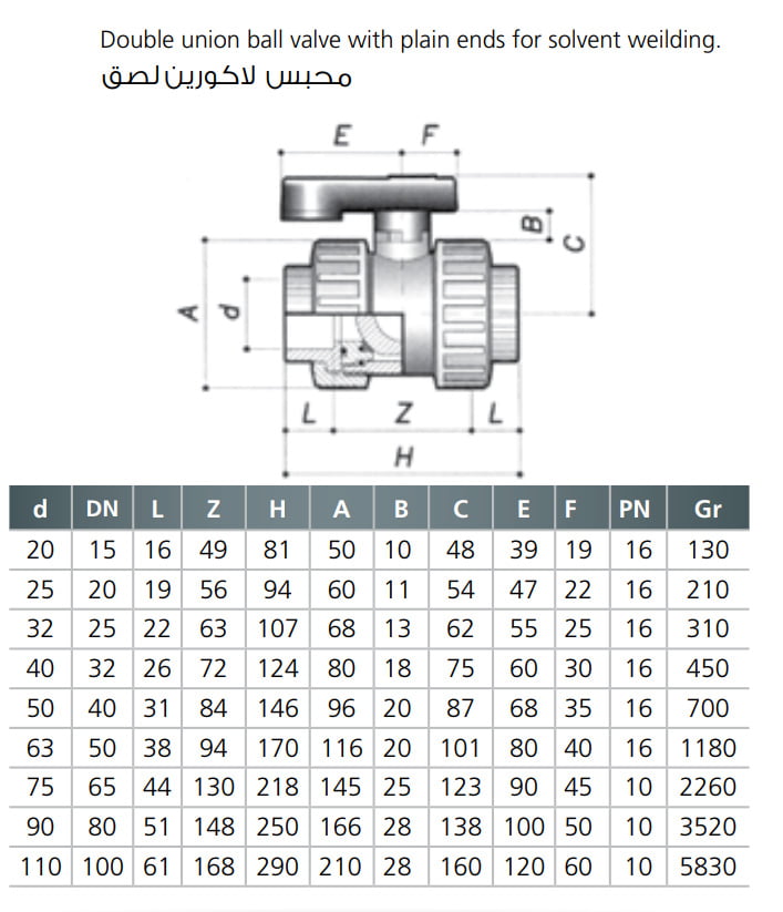 ½”, ¾”, 1”, 1½”, 2”, 20 mm, 25 mm, 32 mm, 50 mm, 63 mm