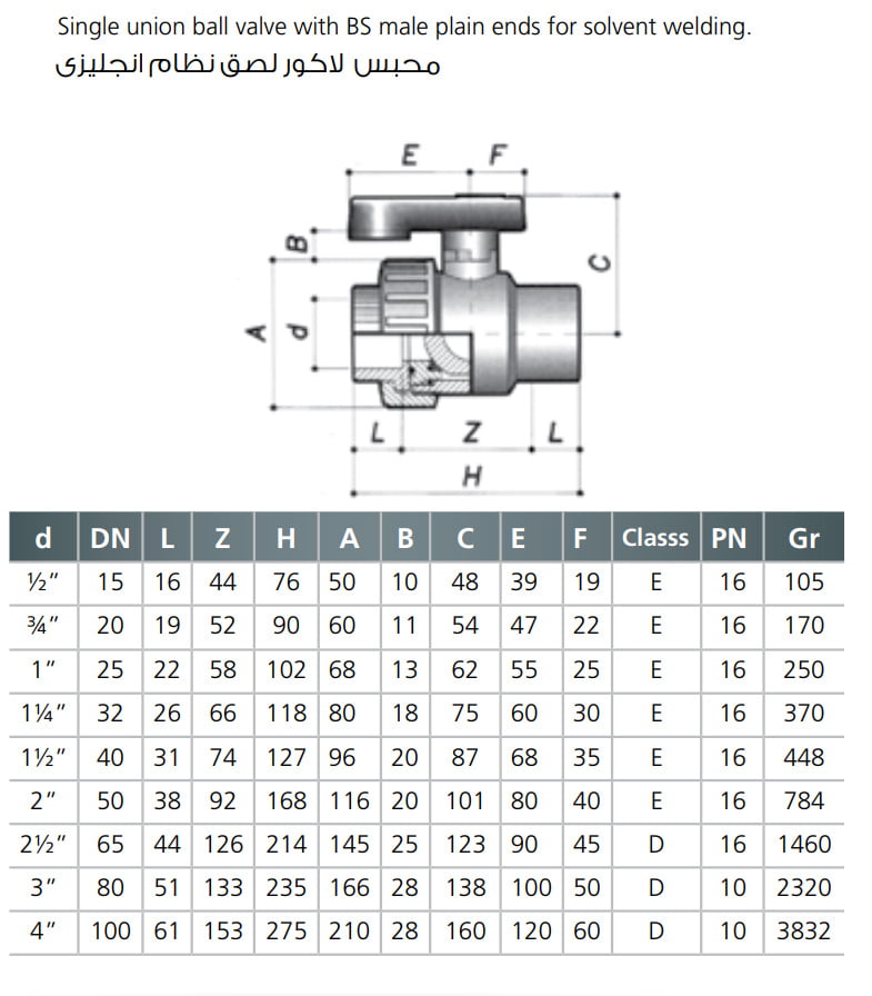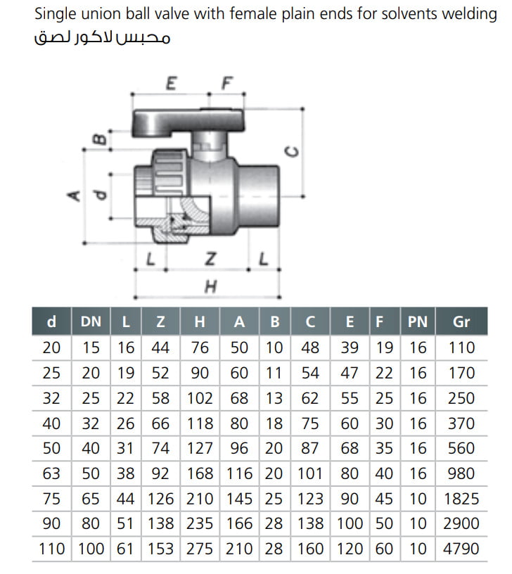 | Diameter | 20x½˝, 25×3/4˝, 32×1˝, 50×1½˝, 63×2˝, ½”, ¾”, 1”, 1½”, 2”, 20 mm, 25 mm, 32 mm, 40 mm, 50 mm, 63 mm |